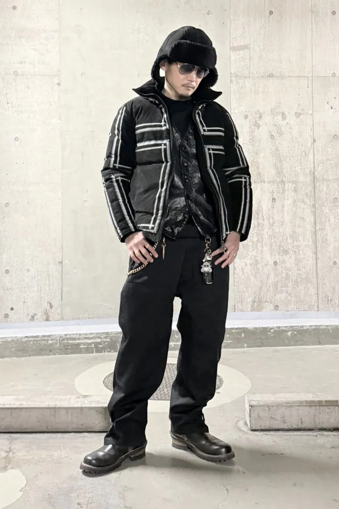 - アウターは、ISAMU KATAYAMA BACKLASH KANGAROO SUEDE “CROSS PRINT” DOWNJACKET[BLACK]:264,000円