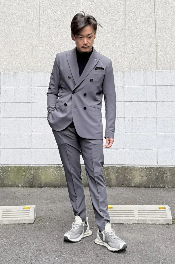 ダブルのジャケットとパンツで大人ラフに