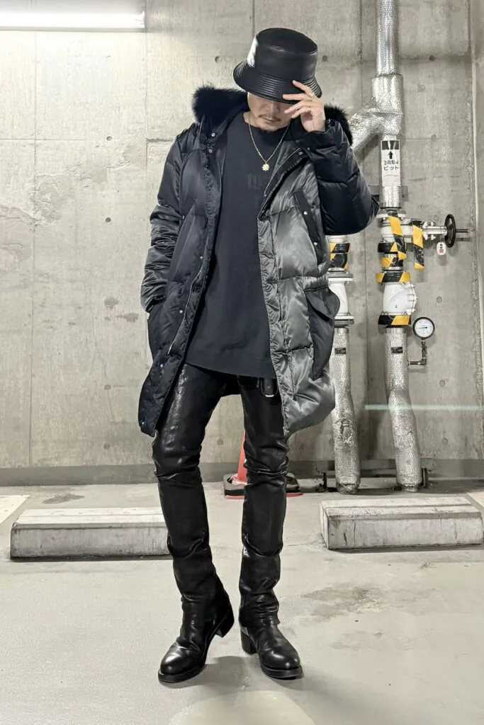 1PIU1UGUALE3のビッグサイズダウンとBACKLASHのビッグサイズなスウェットの組み合わせは抜群。ただしいずれもビッグサイズになってしまうことで全体的に重たい印象を与えてしまうため、ボトムスにはタイトでソリッドなレザーパンツを着用。ハットもレザーにすることで全体的にグレー&ブラックでまとまったシルエットを実現しています。ジュエリーをアクセントとしてあしらうことでさらに締まったスタイルに。