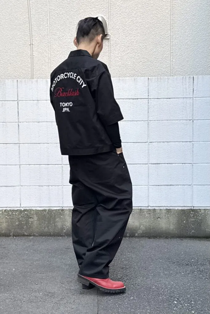 BACKLASHのセットアップ。上下共に高密度に打ち込んだ綿100%の丈夫な綾織りチノクロスを採用。ハリ感と適度な光沢を持つ高密度な素材は、SSシーズンの着用ウェアに必要な軽量で柔らかさに反したタフさ、肌触りの良さが特徴。見た目においてもカジュアルからきれいめなスタイリングまで合わせやすい汎用性の高い素材になります。着るごと、洗いを繰り返すことにより、さらなる着心地と風合いを高めていく素材です。トップスには背面に「MOTORCYCLE CITY BACKLASH TOKYO JPN.」と刺繍。前面のボタンは規則正しく2つずつ並ぶ仕様に。またボトムスは、高い頻度での着回しの良さを求めたクラシックな生地の使用に、日常的に履きやすいシルエットに徹底しデザインした緩やかなテーパードシルエットのカーペンターパンツ。エイジングに期待のある生地感を活かしたフレキシブルに多様なスタイル/シューズに合わせやすいシルエット。腰位置を引き上げ、脚線のシルエットを綺麗に構築し演出可能な程良い股上の深さ、ベルトループに加えてドローコードを内蔵、ラフに着用可能な仕様、ファスナーフライとなっています。